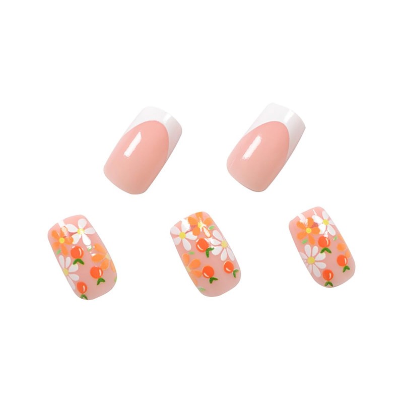 24Pcs Flowers Press on Nails Medium Coffin Fake Nails Orange White French Tip Press ons Summer Daisy Flower Fruit Full Cover Stick on Nails Square Acrylic False Nails Reusable Artificial Glue on Nails