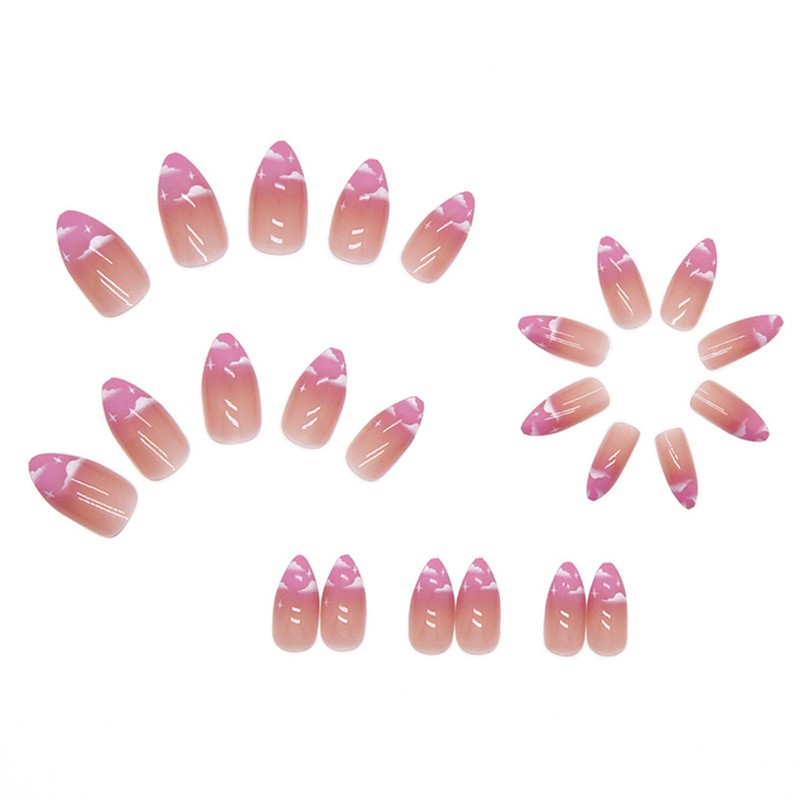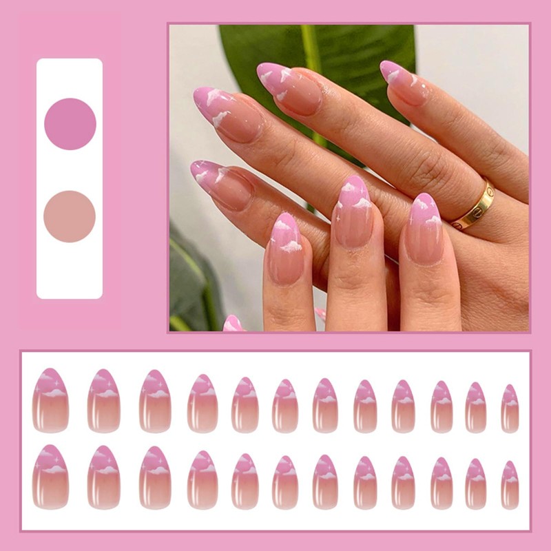 24Pcs French Fake Nails Short, Almond Press on Nails Glossy Nude Pink False Nails with Water Drop & Clouds Design, Oval Acrylic Reusable Full Cover Glue on Nails for Women Girls Nail Art Accessories