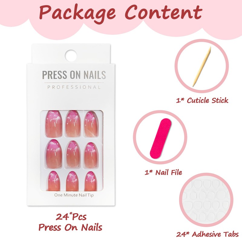 - 💅【Great Package】Package contains 24 pieces of glossy press on nails in 12 different sizes, no matter the size of your nails, you can choose a fake nail that fits your nails and you can also trim them to fit your natural nails. Also come with 24 jelly glue stickers, 1 nail file, and 1 cleaning stick packaged in a storage box. Great bang for your buck!