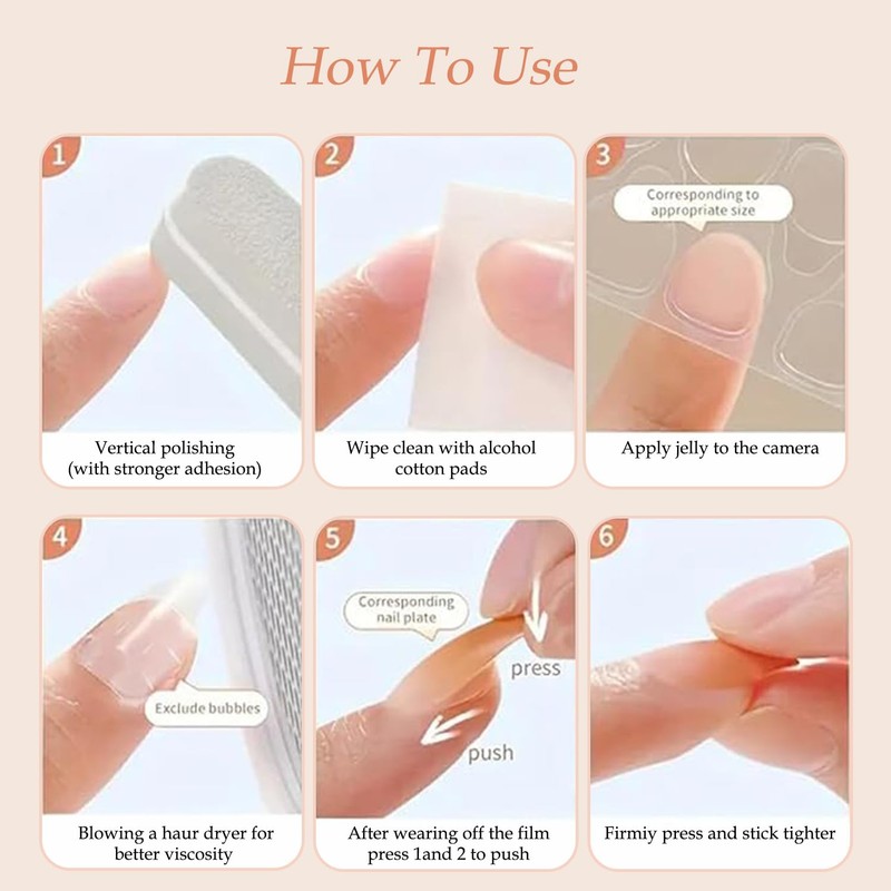 ✅ 1️⃣ Select the Right Size: Choose a press on nail that fits each of your natural nails perfectly. ✅ 2️⃣ Prepare Your Nails: Clean your natural nails and gently buff the surface to remove any oil or residue. ✅ 3️⃣ Apply the Jelly Adhesive: Peel off the jelly glue sticker, place it on your natural nail, and press it firmly to secure. ✅ 4️⃣ Attach the Press On Nail: Align the fake nail with your cuticle, press down evenly, and hold for 10-15 seconds for a secure fit. ✅ 5️⃣ Enjoy Your Manicure: Your french tip false nails are now perfectly applied! To remove, gently lift the stick on nails from the side using a nail stick—no damage to your natural nails!