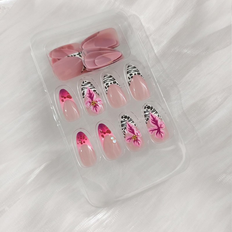 - 3D Flower Nail Art: Elegant almond false nails, featuring stunning embossed floral design and black white leopard print, creating a fashionable french flowers nail art style