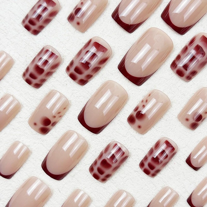 24Pcs French Tip Press on Nails Square Fake Nails Short Acrylic Nails Brown False Nails Tips Crocodile Pattern Glue on Nails Glossy Artificial Full Cover Stick on Nails for Women Girls