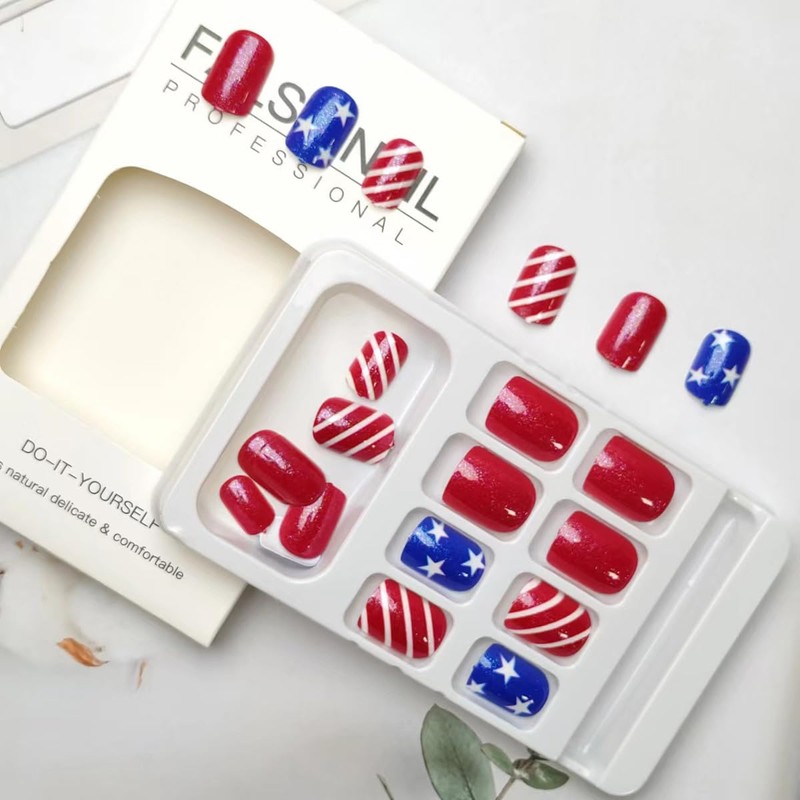 - Package: You'll get 24 pieces Independence Day press on nails,1 mini nail file, 1 small wooden stick, 24 grain jelly glue. You can safely choose a fake nail that fits your finger size and DIY your desired nail shape.
