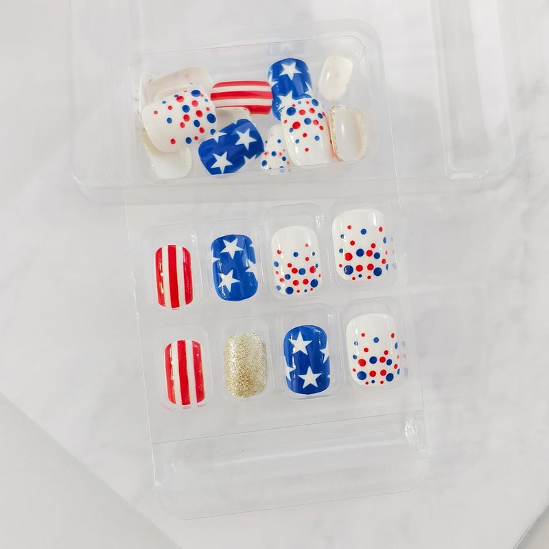 - Materials: Glossy short square artificial fingernails are made from acrylic material, These cute red white blue acrylic nails are gentle for your body and nails, please use them with confidence