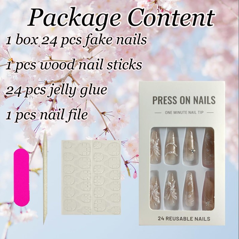 - Butterfly Nails Set :24Pcs Spring Long Almond Press on Nails +1 Nail File + 24Pcs Jelly Glue Stickers+1 Wooden Stick.Durability of jelly glue is not as good as liquid glue, but it makes butterfly fake nails reusable