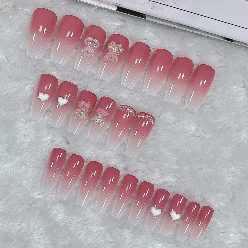 24pcs Long Press on Nails Coffin,CINSEVAN Pink and White Acrylic Three-dimensional Decorations Bear Heart Designed Fake Nails, Reusable Soft False Nails with Storage Box for Girls Ballet
