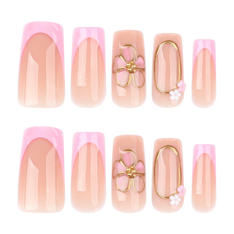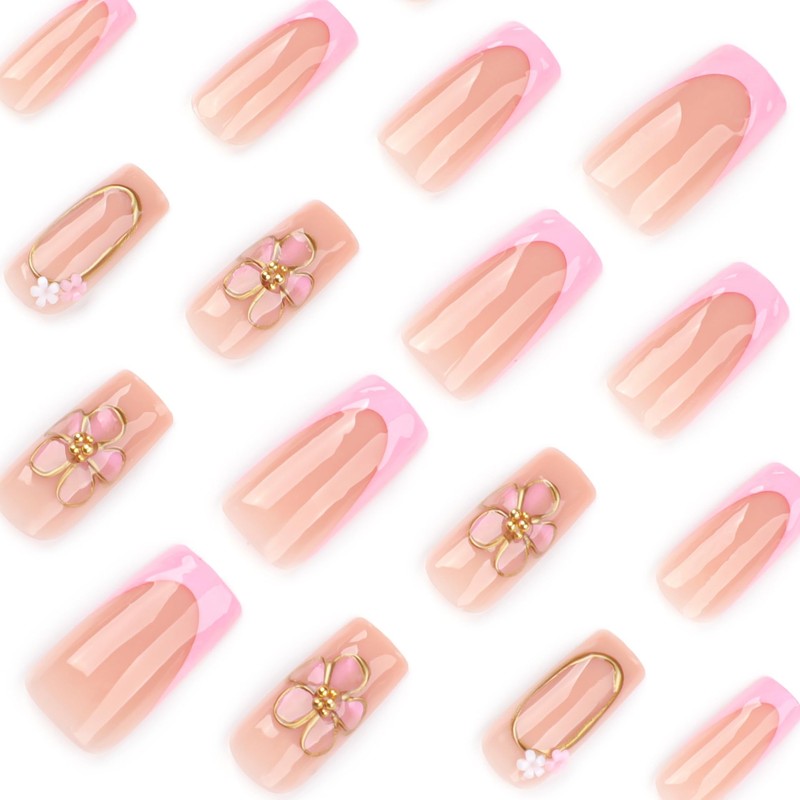 24Pcs Long Square Press on Nails 3D Flower Fake Nails Pink French Tip False Nails Kit Spring Summer Reusable Nails Artificial Acrylic Nails Press ons Glossy Full Cover Glue on Nails for Women Girls