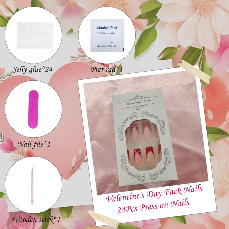 - Package Contents:You will get 24 pieces valentines press on nails in,12 different sizes,1piece mini nail file,24 jelly glue,1piece alcohol pad,1piece wooden stick.glitter is easy to fall off,please apply another layer of protective glue.