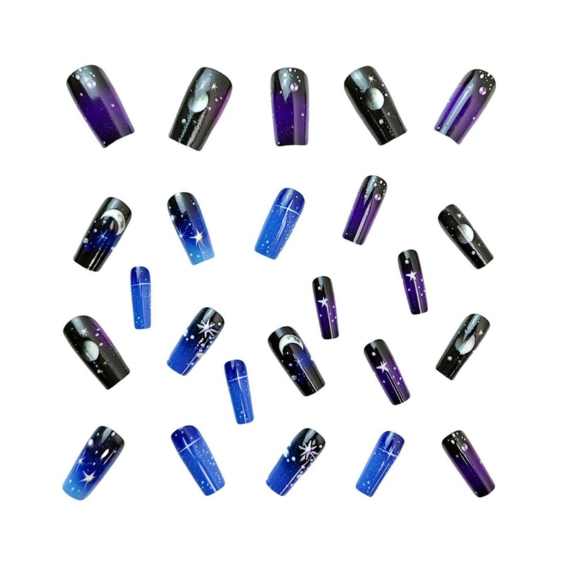 - Packaging: 24 black blue fake nails in 12 different sizes, 24 jelly glue, a small wooden stick for removing nails, and a polished nail file.