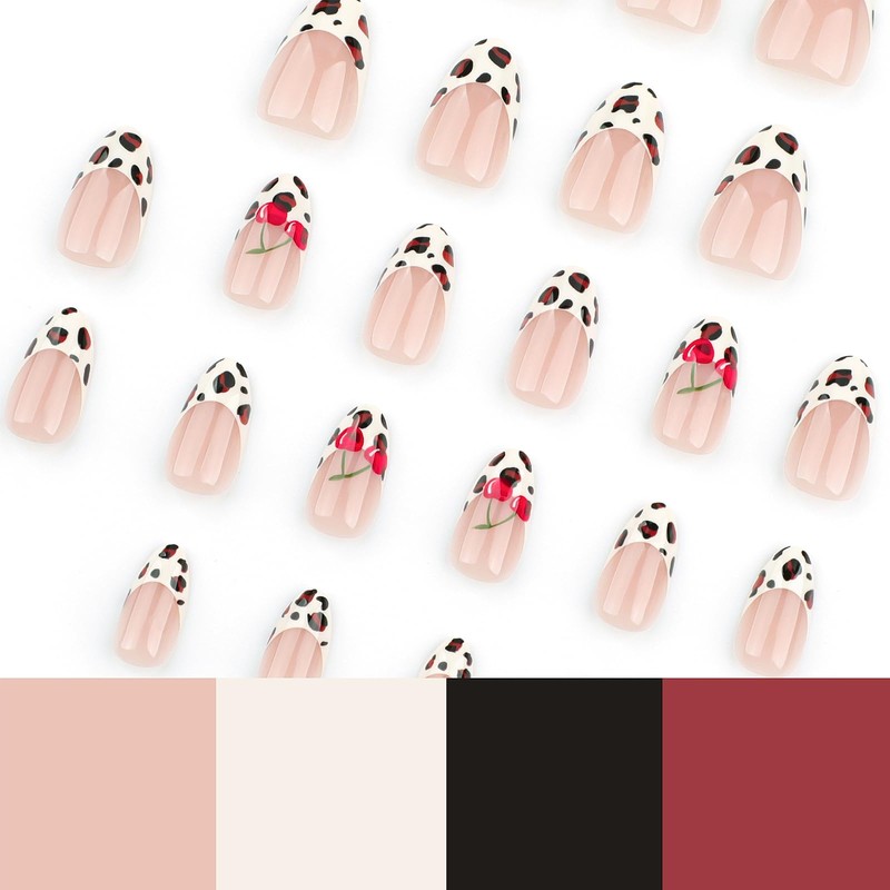 24pcs Press on Nails Short - Almond Fake Nails with Glue - Leopard Print French Tip False Nails - 12 Sizes Glue on Nails with Cherry Designs - Full Cover Cute Stick on Nails for Women Girls