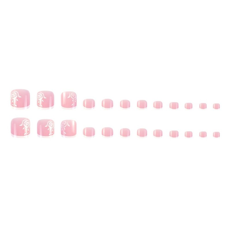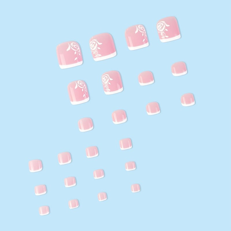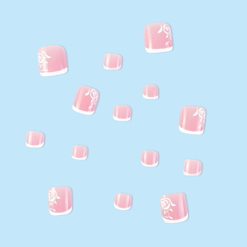 24Pcs Press on Toenails French Tips Toe Nail Press ons Fake Toe Nails Pink False Toenails Glossy Full Cover Acrylic Glue on Toenails with Designs Flower Artificial Stick on Toenails for Women Manicure