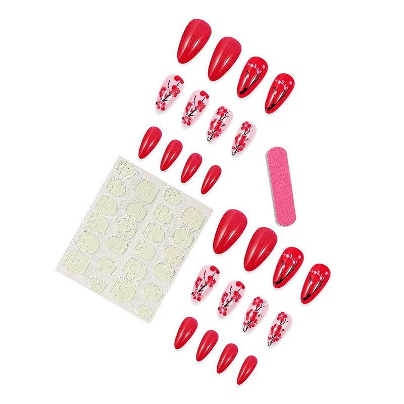 24PCS Red Flower Press on Nails Medium Almond Fake Nails Leaf False Nails Romantic Peach Blossom Design Full Cover Artificial Glue on Nails Glossy Stick on Nails Spring False Nails for Women DIY Kit