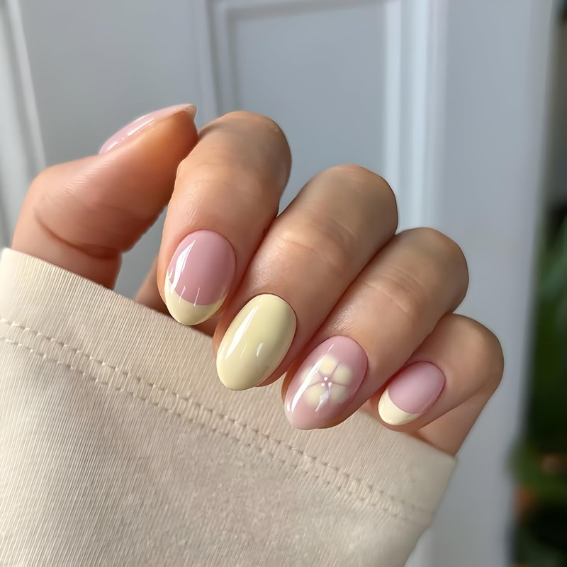 24Pcs Short Press on Nails Flower Fake Nails French Tip Glue on Nail with Yellow Flower Design Almond Stick on Nail Yellow Glossy Nails Press Ons for Women DIY Party False Nail Decoration Set