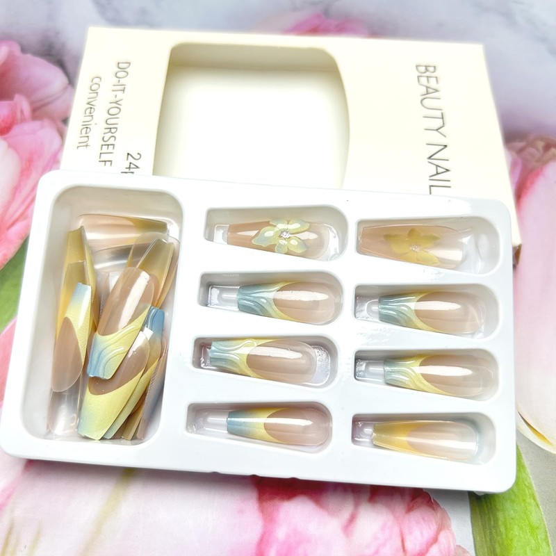 1.Yellow and blue french press on nails are easy to use, it only takes a few minutes to complete a manicure.