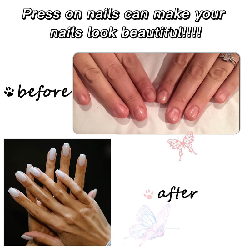 - 【Easy to Use False Nails with Glue】Just gently polish your nails, file the sides and cuticle area with a nail file for an accurate fit and clean the dust. Apply glue on the nail, then select the right size of press on nails for each nail, stick on the false nails and press on them for 25s.Then you will get a nature and beautiful manicure.