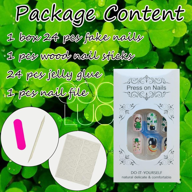 - St. Patrick's Day Nails Kit : 24 PCS ,12 different sizes of St. Patrick's day press on nails medium nails, 24 jelly glue, 1 nail file, 1 wooden stick.full range of tools meet all your shamrocks nails decor supplies wearing needs. It can be worn repeatedly so that you can replace it at any time