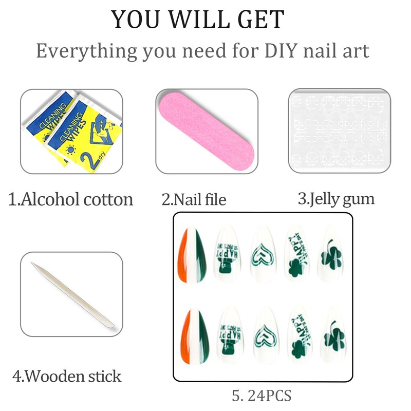 - 【Press On Nail Kit】- 24pcs/12 sizes of almond nails, 1 nail file, 1 wooden stamp, 24pcs jelly glue. (If you need to wear it for a long time, please use your own nail glue)