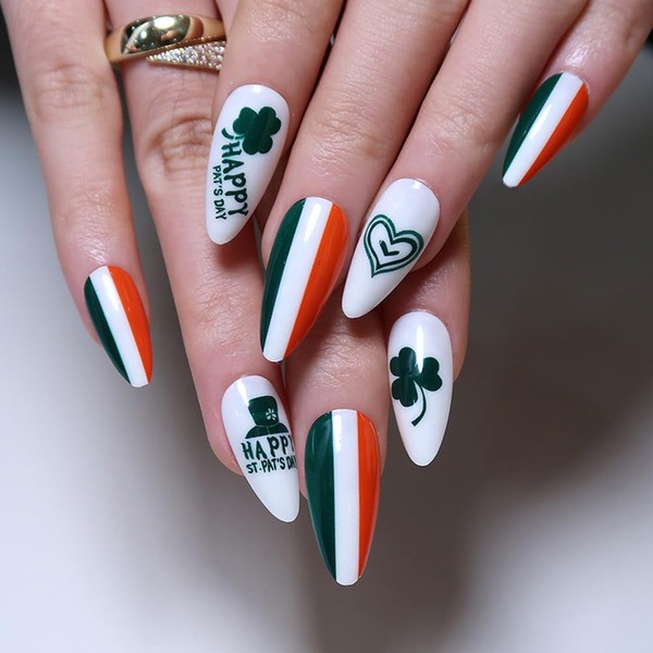 24Pcs St Patricks Day Press On Nails, Almond Press On Nails Medium Fake Nails with Green Shamrock & Heart Hat Design, Artificial Nails Stick On Nails for Women