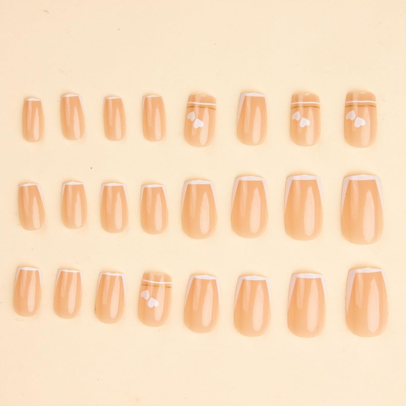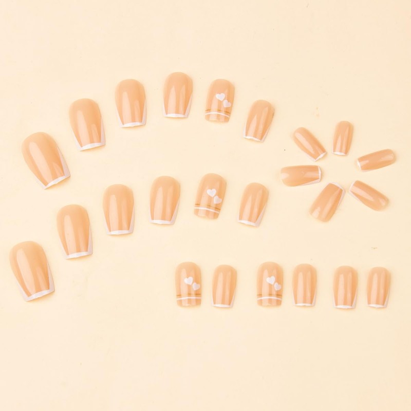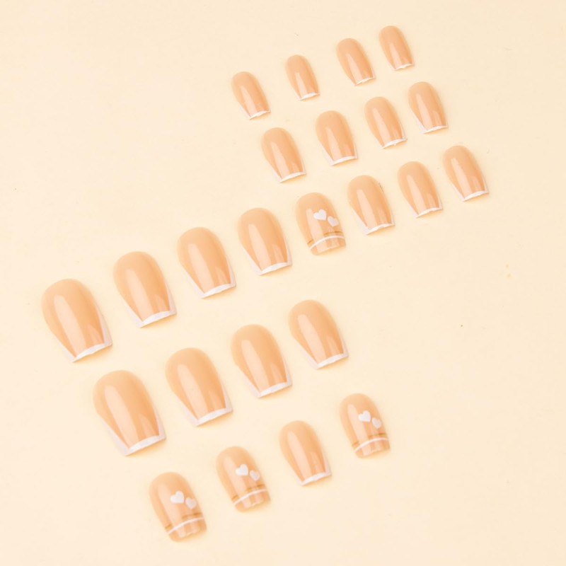 4.Peel off the protective layer on top of the sticker. Choose the right size white french heart fake nail and place it on your nail.
