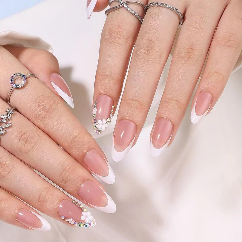 24Pcs White French Tip Press on Nails Fake Nails Medium Rhinestones Designs, Cute Fake Flower Nails Tips Full Cover Cute False Nails Charms French Nails Tips for Women and Girls 24PCS