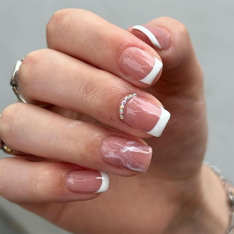 - High-quality False Nails: Made with quality materials, our set of 24 white french tip fake nails feature a trendy silver glitter rhinestones acrylic design in glossy,give 24 pcs jelly gel 1 wooden stick 1 nail file perfect for manicure decoration