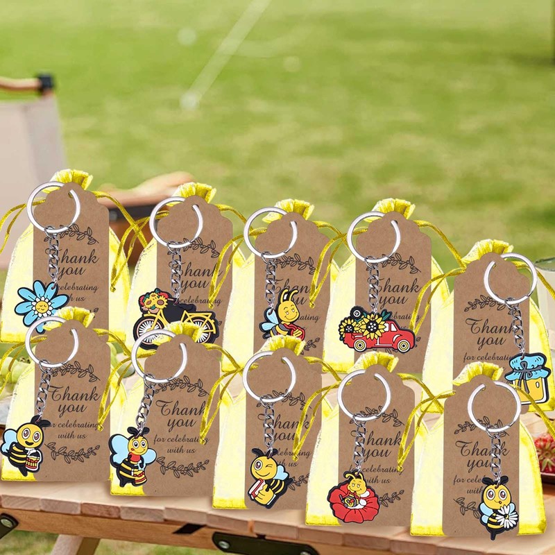 • Superior Materials: The set comes with 24 keychains, matching drawstring bags, and thank you tags, all created from superior materials.Our bee keychains are crafted from top-grade PVC for enduring use. The drawstring favor bags are made from resilient organza, and the included thank you cards are created from elite cardstock that is environmentally friendly and tear-resistant.