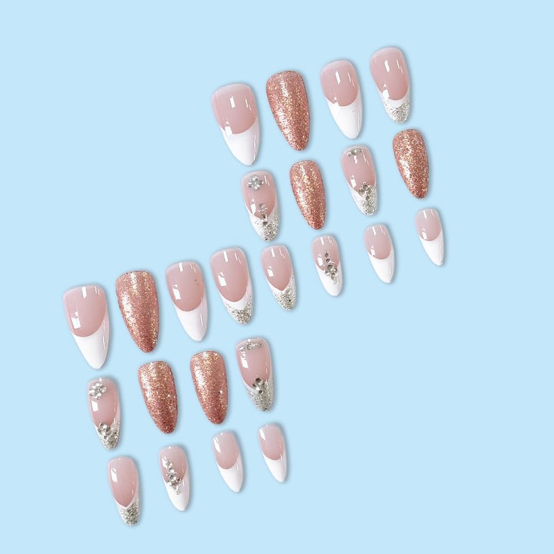 24STK French Press on Nails Mittellange Almond Künstliche Nägel Weiß Rand Fingernägel zum Aufkleben Glitzer Silber Rosa Strass Klebe Nägel Set Acrylnagelspitzen Frühling Accessories für Damen
