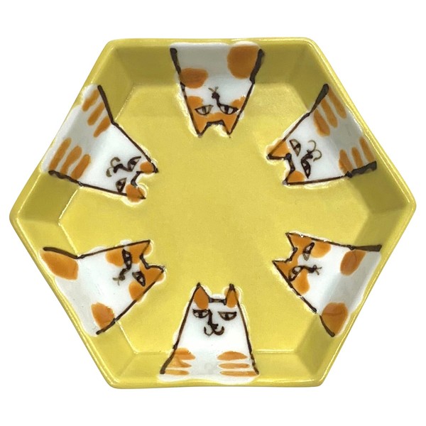 24to3 477451 Nishitomi Pottery Arita Ware Plate, Small Plate, Approx. 3.9 inches (10 cm), Hexagonal, 6 Cats, Yellow, Made in Japan