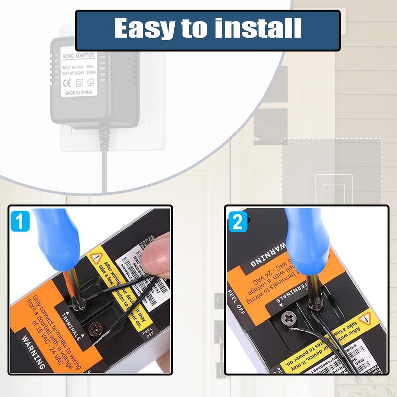 - Easy to Install: 2 pin non-polarity wires support easy and quick install, Assemble along the wall from your outlet to the doorbell and thermostat, ensure the adapter is firmly connected to the doorbell. After checking for accuracy, insert the adapter into the socket.