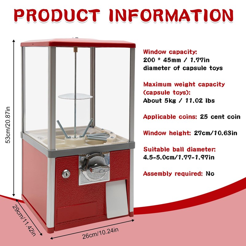 25 Cents Coin Operated Vending Machine, Commercial Gumball Machine, Toy Capsule, Vending Machine, Dispenser Prize Machine, Candy Machine Dispenser for Small Candy, Nuts, Feed (Red)