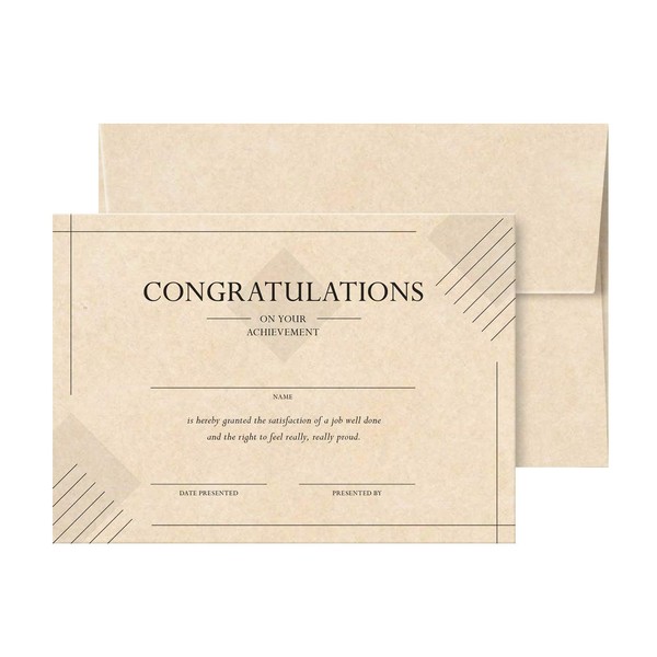 25 Congratulations On Your Achievement Parchment Award Certificate, 5" x 7" Fill-in-The-Blanks Recognition & Accomplishment Card & Envelopes for Graduation, Students, Employees – NOT A Fold Over Card