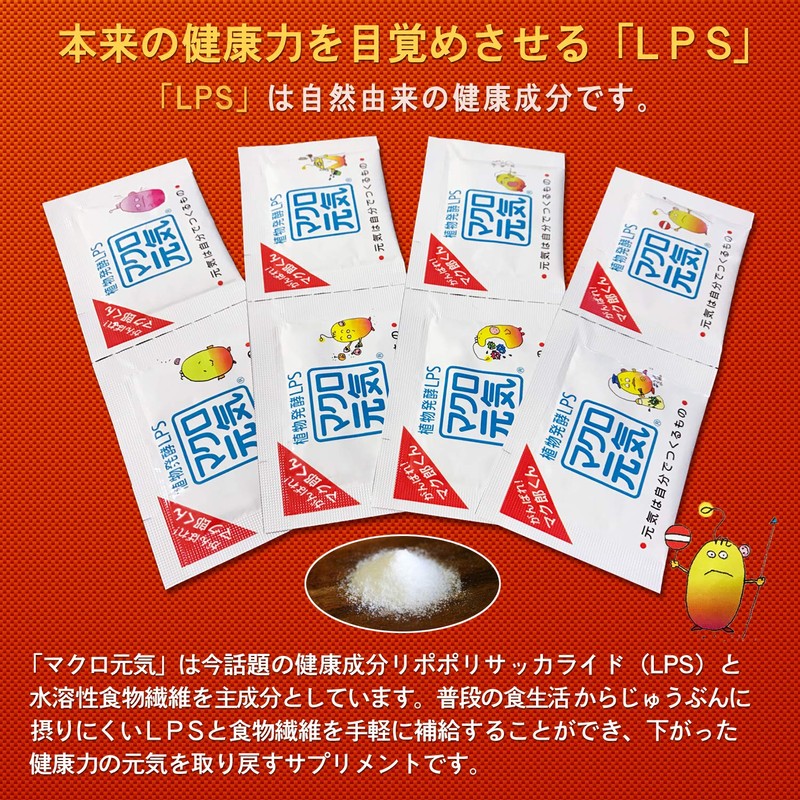 - LPSサプリメント「マクロ元気」が25%増量してリニューアルしました。リポポリサッカライドも食物繊維も25%増量(従来品比)。1日に必要なLPS(500μg)を、2包で補給できます。皆様のご愛顧に感謝して、中身は増えても価格はそのままお届けします。