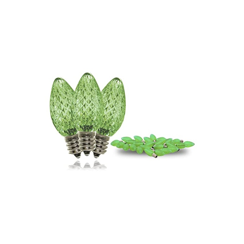 Christmas lights have never been so bright and vibrant. These C7 size retrofit replacement bulbs are green. They are specially made to be dimmable. They are commercial grade, faceted LED screw-in replacement bulbs designed for traditional incandescent C7 (E12 socket) sockets. They have a 1-1/2" cone. Each has one super bright LED's encapsulated by a hard-to-break lens (unlike the old-fashioned and very fragile incandescent bulbs). Each bulb consumes .58 watt of power on one 15 amp circuit. Fits directly into existing traditional sockets without extra transformers. Saves up to 90% on electric use. Recommended for computer animated displays requiring dimming. Sold in packs of 25 bulbs.