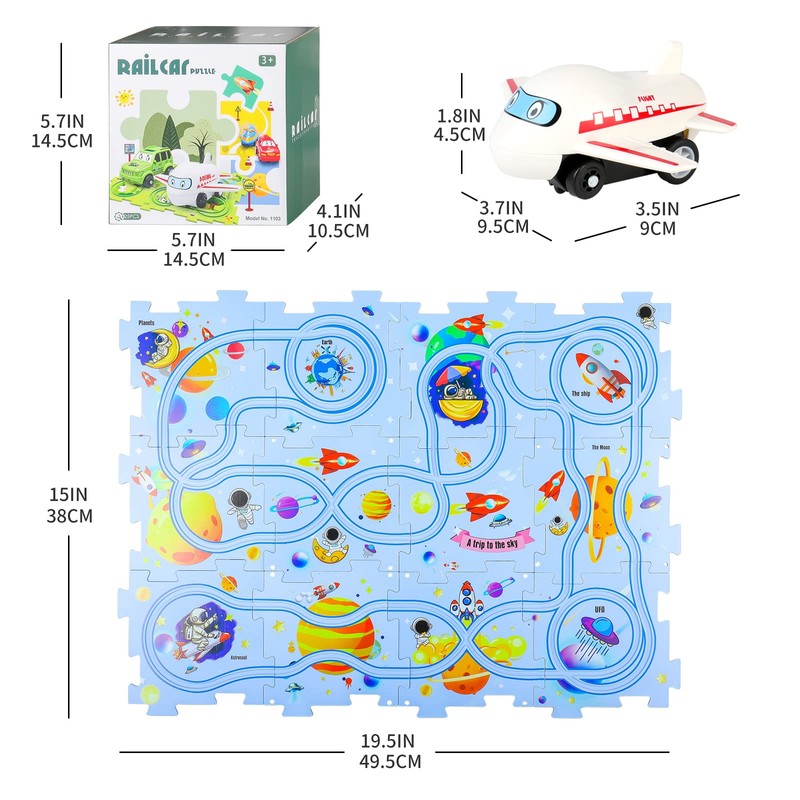 - New Jigsaw Puzzles & Track Car Toys for Kids: this kids puzzles set includes 12 puzzles pieces, 12 road signs, 1 airplane shaped vehicle(1 AAA battery required, not included). Kids need to assemble the puzzles pieces in a certain to allow the plane to follow the track.