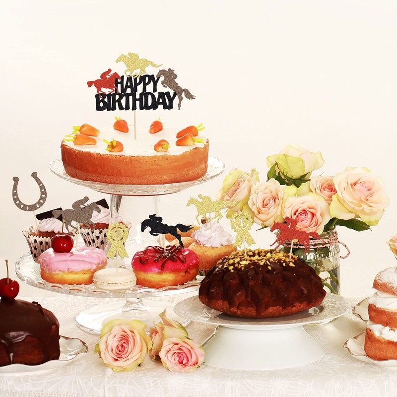 - Suministros para fiestas de caballo: 25 decoraciones para cupcakes de caballo son perfectas para fiestas temáticas de derby, fiestas temáticas de ecuestre, fiestas temáticas de caballos, fiestas temáticas de baby shower, decoraciones de cupcakes de fiesta temática de cumpleaños infantiles, harán que tu cupcake sea más atractivo y traerán la diversión a tu fiesta, ¡hará que tus invitados se enamoren de ellos!