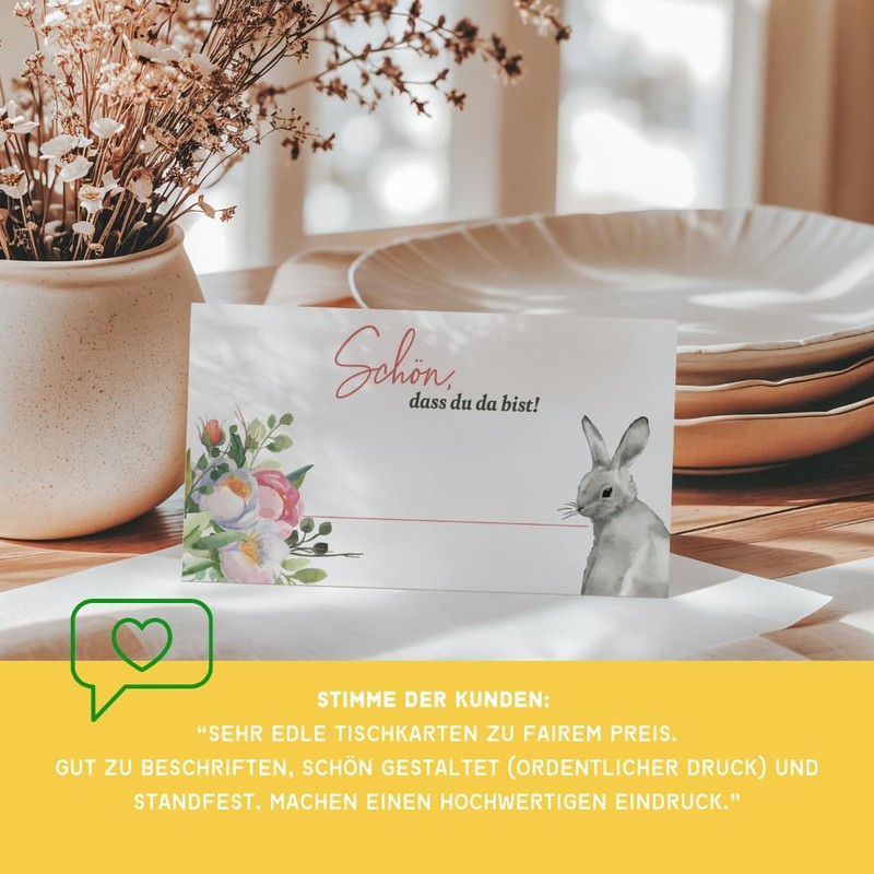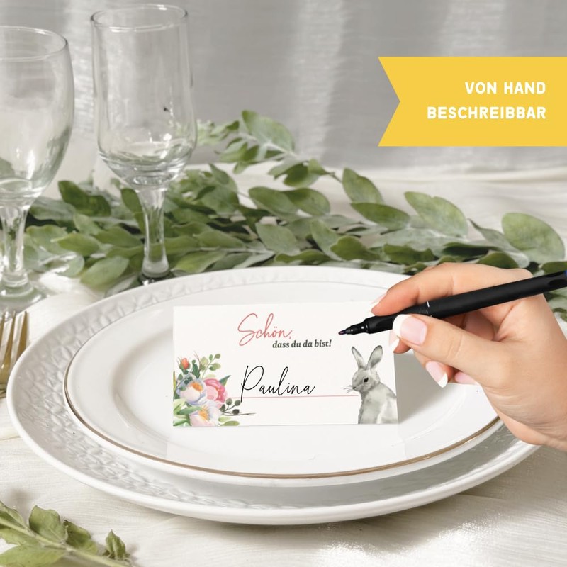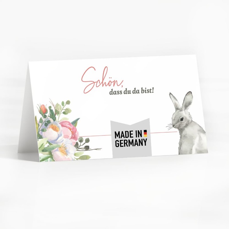 - Table cards: The set consisting of 25 foldable and stand-up Easter place cards in a cute watercolour Easter bunny design was printed on high-quality 350 g/m² quality paper in Germany.