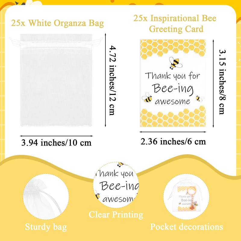 - 【Perfect combination】Our Inspirational bee gifts set contains 25 exquisite bee keychains, 25 meaningful thank you cards and 25 elegant organza bags, all in matching colors; this exquisite employee appreciation gift box is ideal for expressing your gratitude to hard-working employees, and also provides you with a convenient way to share with others, meeting all your needs.