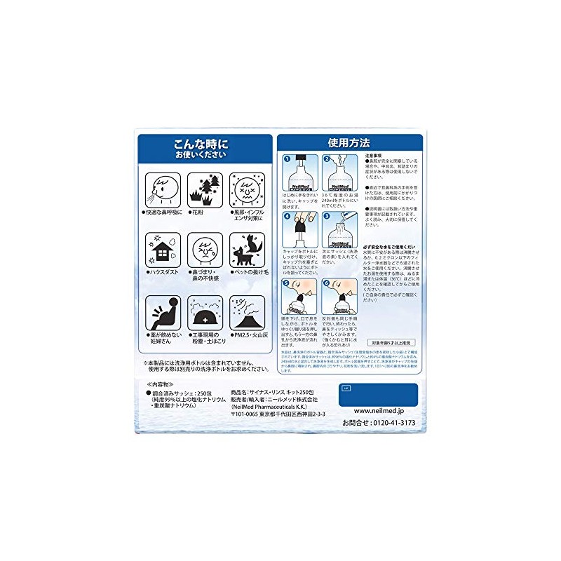 • 原材料・成分 サッシェ:96%塩化ナトリウム、4%重炭酸ナトリウム ご注意(免責)>必ずお読みください 【重要】中耳炎にかかっている方は使用しないでください。/水道水は一旦煮沸して冷ましてご使用ください。 1.ご使用になる前にボトルに傷や不具合がないかご確認ください。 2.痛みを感じた場合は、直ちに使用を中止し、専門医の指導を受けてください。 3.鼻・耳の炎症がひどい場合は、ご使用前に専門医の指導を受けてください。 4.鼻・耳の手術後の方は主治医の指導を受けてください。 5.幼児の手の届かない場所に保管してください。 6.調合済みサッシェは、必ずニールメッド専用のボトル容器でご使用ください。 7.精製水、もしくは煮沸水を人肌程度の温度に調整し、ご使用ください。 8.感染する可能性がありますので、ボトル容器は他の人との共用はしないでください。 9.ボトル容器は清潔な場所で保管し、衛生のために3ヶ月に一度交換してください。 10.使用後、鼻を強くかまないでください。 11.鼻腔に残留した洗浄液が、時間が経過した後に少々流れ出てくることがあります。
