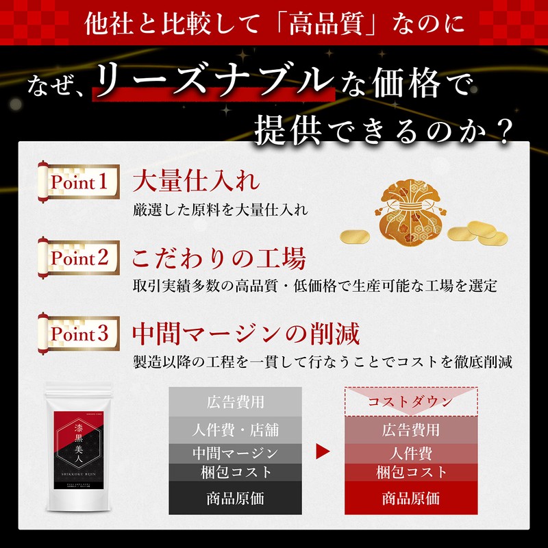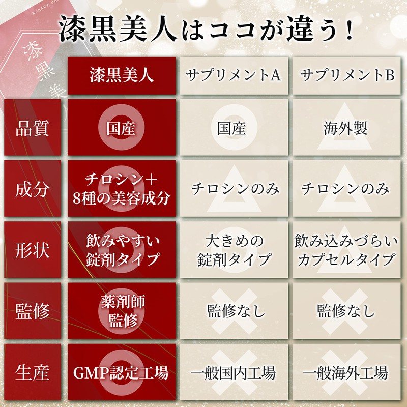 - 「黒く艶やか」で美しい毎日を。話題の黒艶成分チロシンを250mg配合。黒々とした髪・艶を手に入れたい女性のために、美しさをサポートします。