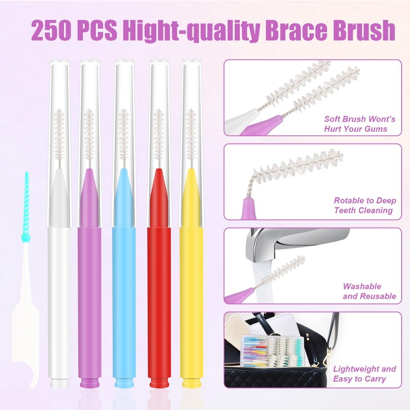 250pcs Interdental Brushes for Braces, 5 Colors Soft Bendable Braces Brushes Dental Teeth Flossing Head Disposable Hygiene Flosser Toothpick tooth Cleaning Tool Gum Braces