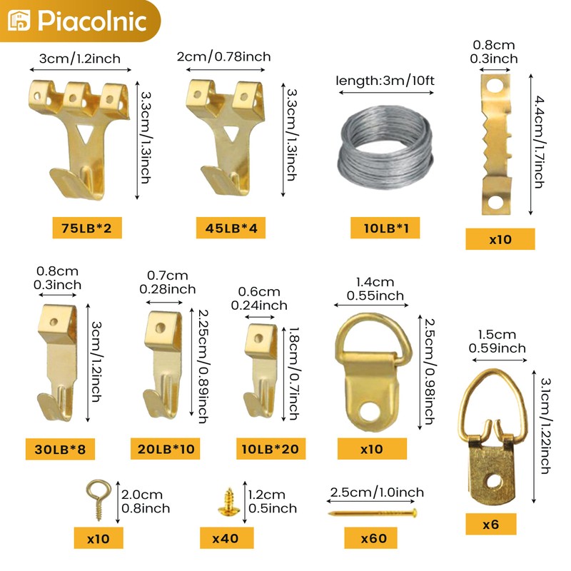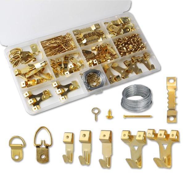 - 【Great Assortment】Having a pack of picture hanging with a diversity of sizes is very convenient. You will receive 250pcs picture hanging hardwares, including 2pcs 75LB hooks, 4pcs 45LB hooks, 8pcs 30LB hooks, 10pcs 20LB hooks, 20pcs 10LB hooks, 60pcs nails, 10pcs serrated hook,10pcs D shape ring hook, 40pcs screw, 10pcs Sheep-eye shape nail, 1pcs 10LB 10feet steel wire.