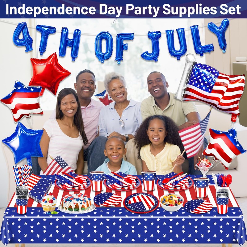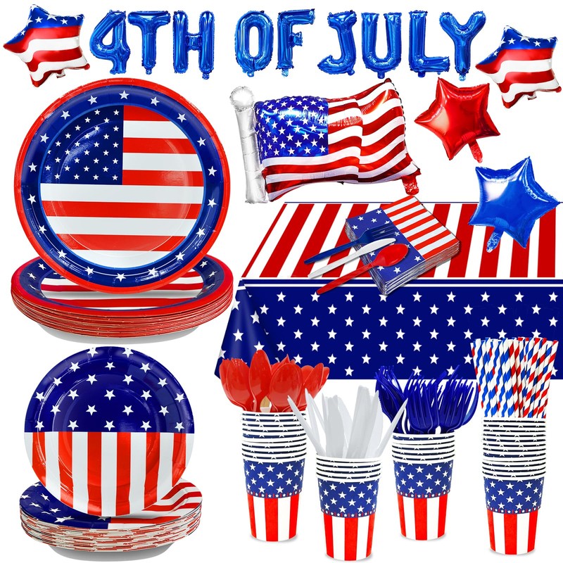 - 【255 Pcs of Patriotic Party Supplies】Including 255pcs and13varieties. Enough for 30 guests, including 30* large paper plates(9inch), 30* small paper plates(7inch), 30* plastic forks(6.3inch), 30* plastic spoons(6inch), 30* plastic knives(6.6inch), 30* cups(3.5*3inch), 30* napkins(6.5inch), 30* straws(7.7inch), 1*Independence Day tablecloth(108*54inch),9*letter aluminum balloons, 1 flag aluminum balloons(25.5*18.9inch),2*flag star aluminum balloons(17.6*17.6inch),2*star aluminum balloons red and blue one each(17*17inch) and dot glue、ribbon、baloon tying tool.