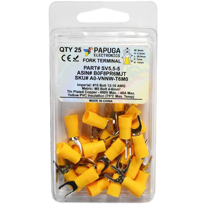 25PCS 12-10 AWG #10 M5 Insulated Fork Crimp Connector 48A 600V CE for Electrical Terminals (25, #10)