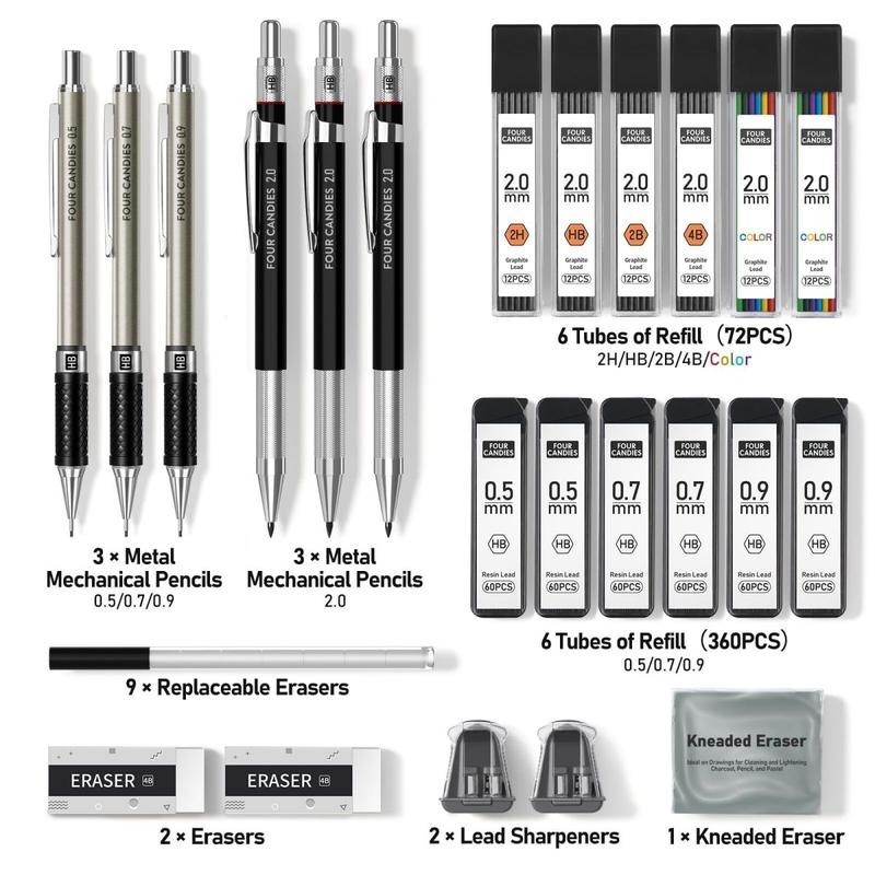 25PCS Art Mechanical Pencil Set with Case, 3PCS Metal Artist Lead Pencil 0.5, 0.7, 0.9 mm & 3PCS 2mm Lead Holder(HB 2H 2B 4B Color) with 432PCS Graphite Lead Refills for Drawing Sketching