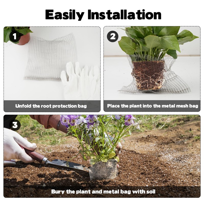 - Easy Installation: You just need to unfold the protective wire mesh barrier bag, place your plant inside, roll up the wire cage, and position it in the prepared hole. Cover with soil, and you're done! It's a time-saving and effortless process.