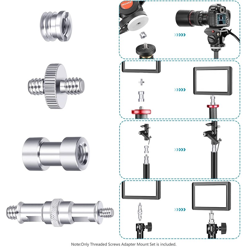 - 【Material Duradero】La mayoría de los tornillos de la cámara están hechos de una aleación de aluminio, la rosca externa de 3/8 "a la rosca interna de 1/4" está hecha de latón, antioxidante y sólido.