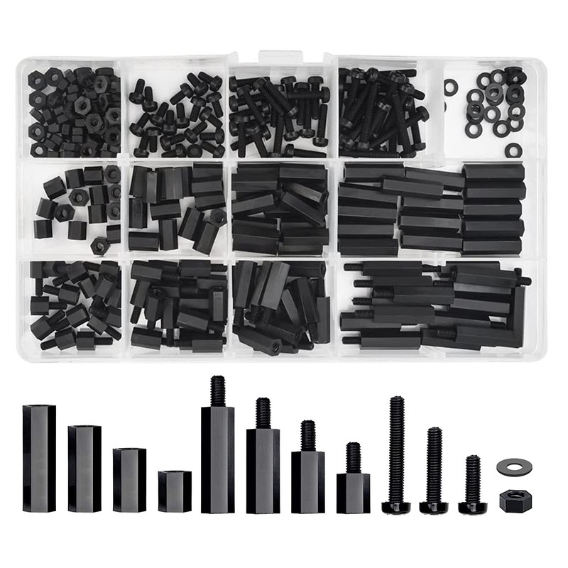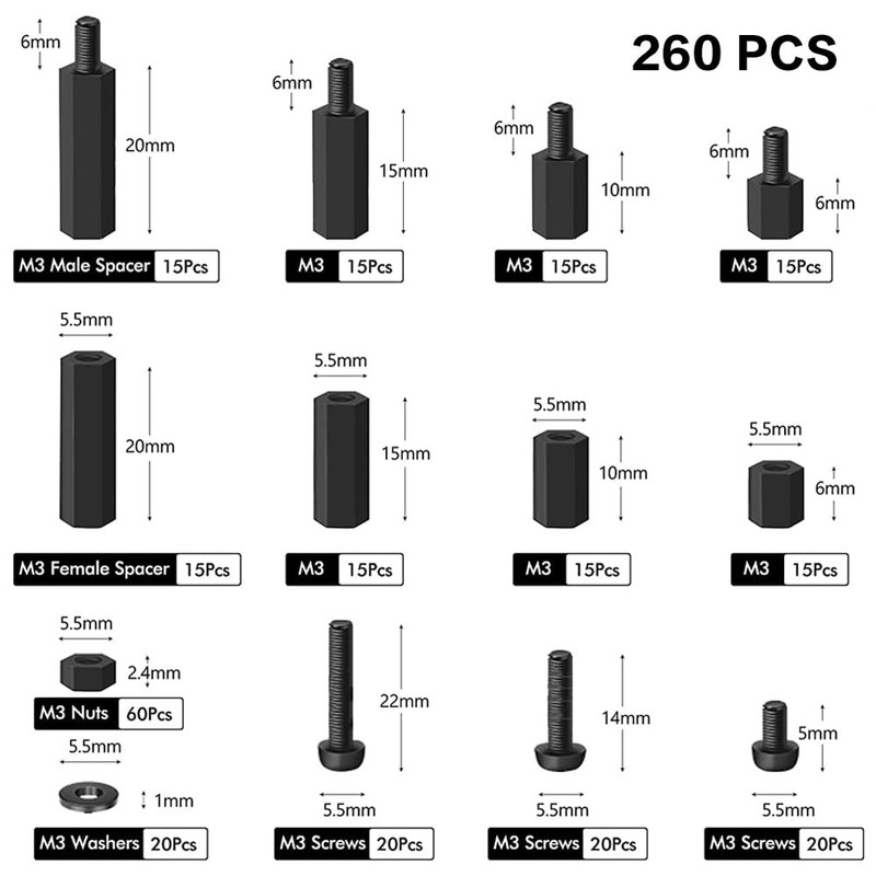 - ◆Multiple Sizes:Nuts And Bolts Assorted Set has a total of 260 small accessories,including 13 types:M3 nuts,M3 washers,M3 screws (3 types of lengths),M3 male-female hex standoff (4 types of lengths),M3 female hexagonal nylon (4 types of length).