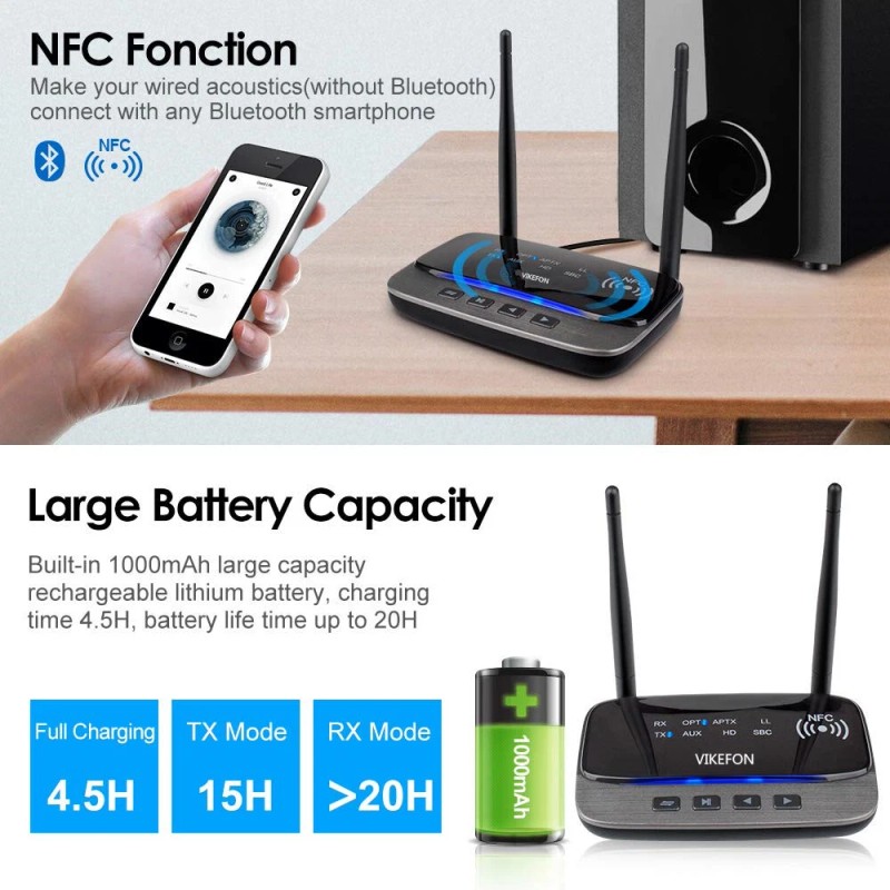 【Dual Stream&Multi-Point Connection】Support Dual Stream in TX Mode and Multi-Point Connection in RX.Pair with two bluetooth headphones/speakers,sharing fun without disturbing others.Or connect two smart phones at the same time,also has a memory function that automatically connects to the last paired device. Supports 3.5mm AUX & RCA digital audio connections/fiber optic audio inputs and outputs, it can also be quickly connected via NFC.