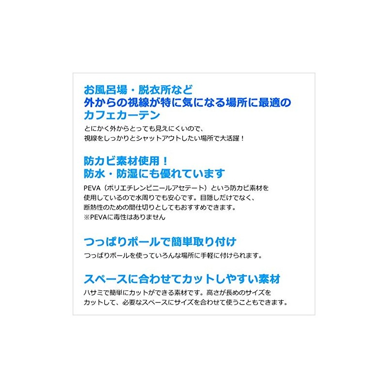 This cafe curtain is perfect for bathrooms and dressing rooms where you are particularly concerned about the outside's eyes especially concern. This product is very difficult to see from the outside and is recommended for places where you want to keep your eyes out. Made with a mold resistant material called PEVA (polyethylene vinyl acetate), so it is safe even around water. Not only for blindfold, but also as a divider for insulation. Non-toxic PEVA You can easily attach it to any location using the tension pole. The material can be easily cut with scissors. You can also cut the extra height to fit the space you need. You can easily hang the rod on the bookend, or use it anywhere you can create a divider. Made from vinyl to create a splash resistant divider for the office or dining room. Easy wipe clean