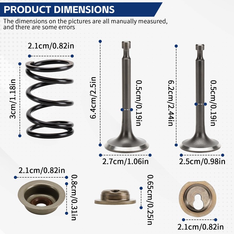 Package includes: 2 x 26lb valve springs, 1 x intake valve, 1 x exhaust valve, 2 x spring retainer, 1 x valve oil seal, 1 x main jet kit (1 x emulsion tube, 3 x main jet .036" .037" .038")
